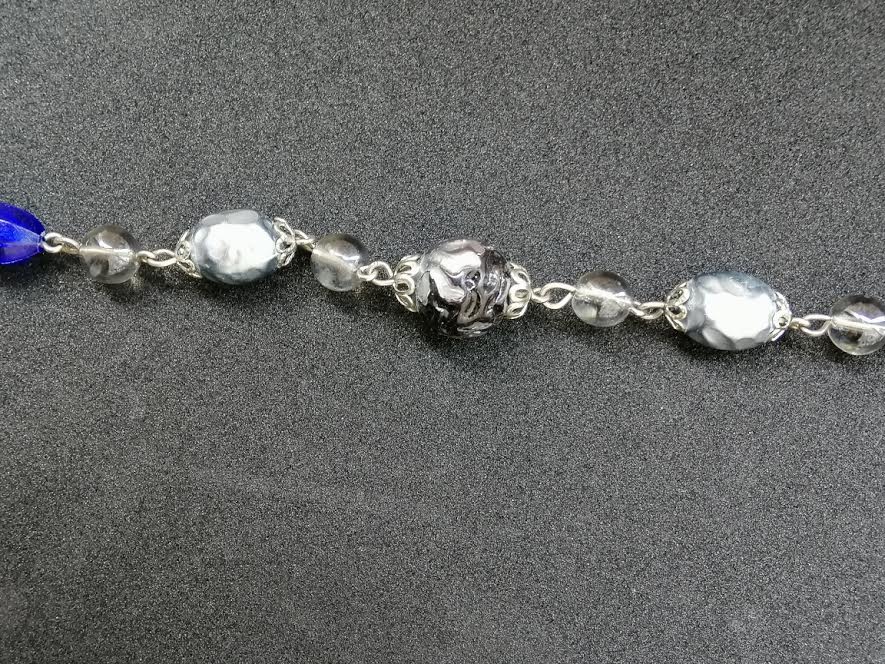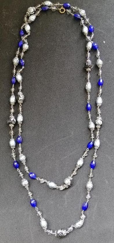 Collier long qui devient double en métal argenté, perles de nacre et de verre