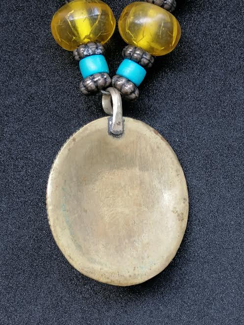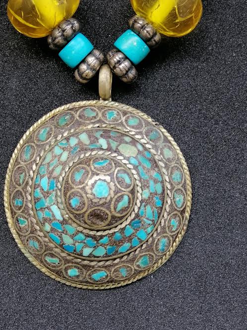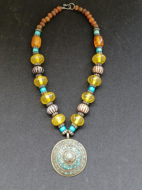 Collier original en ambre et imitation ambre, turquoise, perles de verre et pierre avec trés joli pendentif en métal argenté doré.