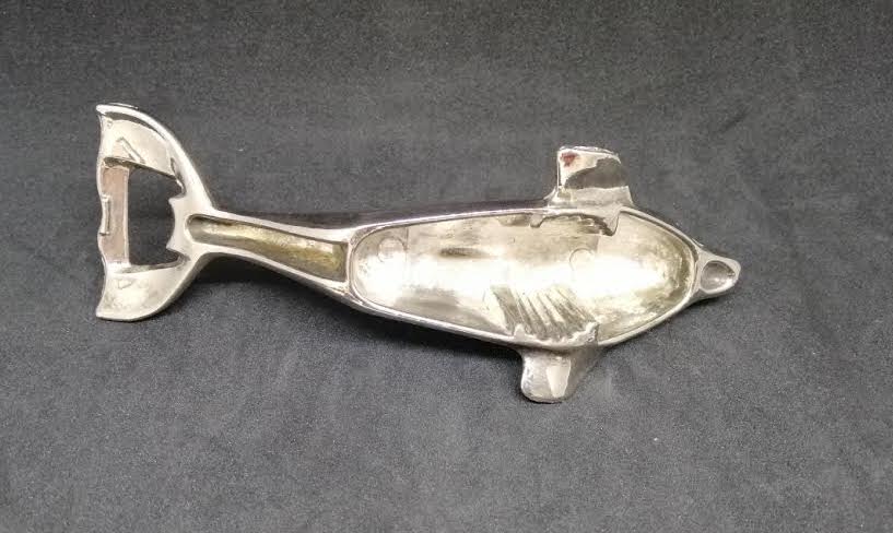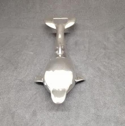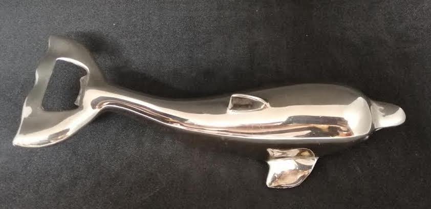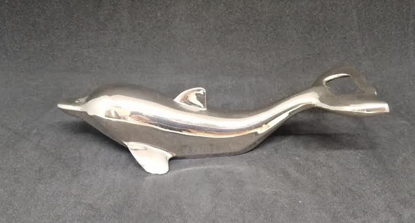 Décapsuleur / ouvre bouteille vintage en métal argenté en forme de dauphin.