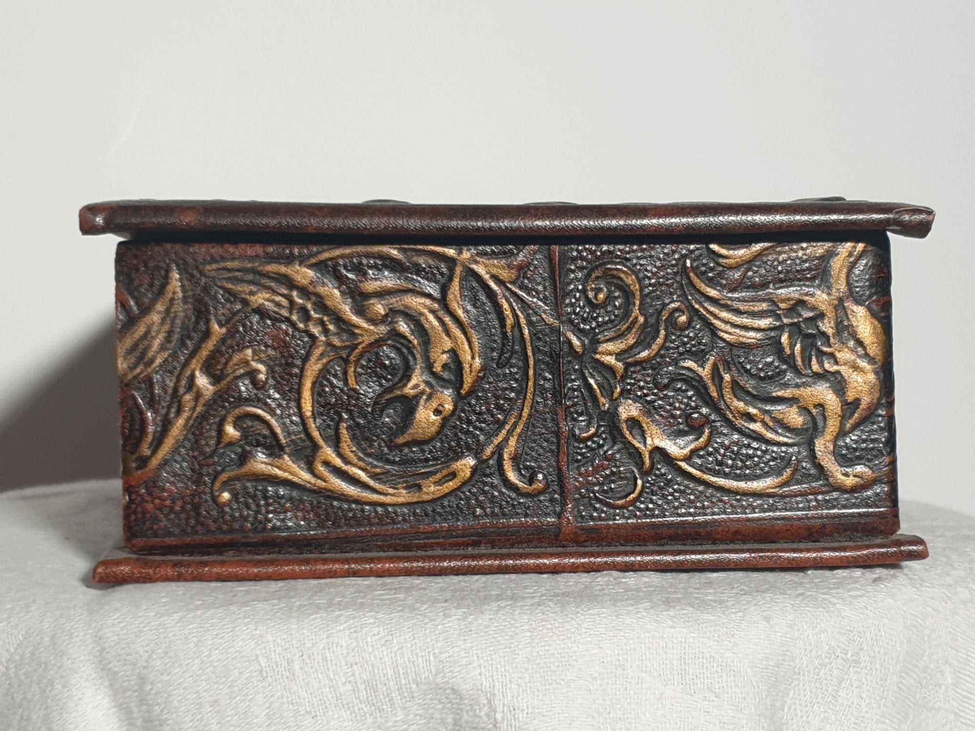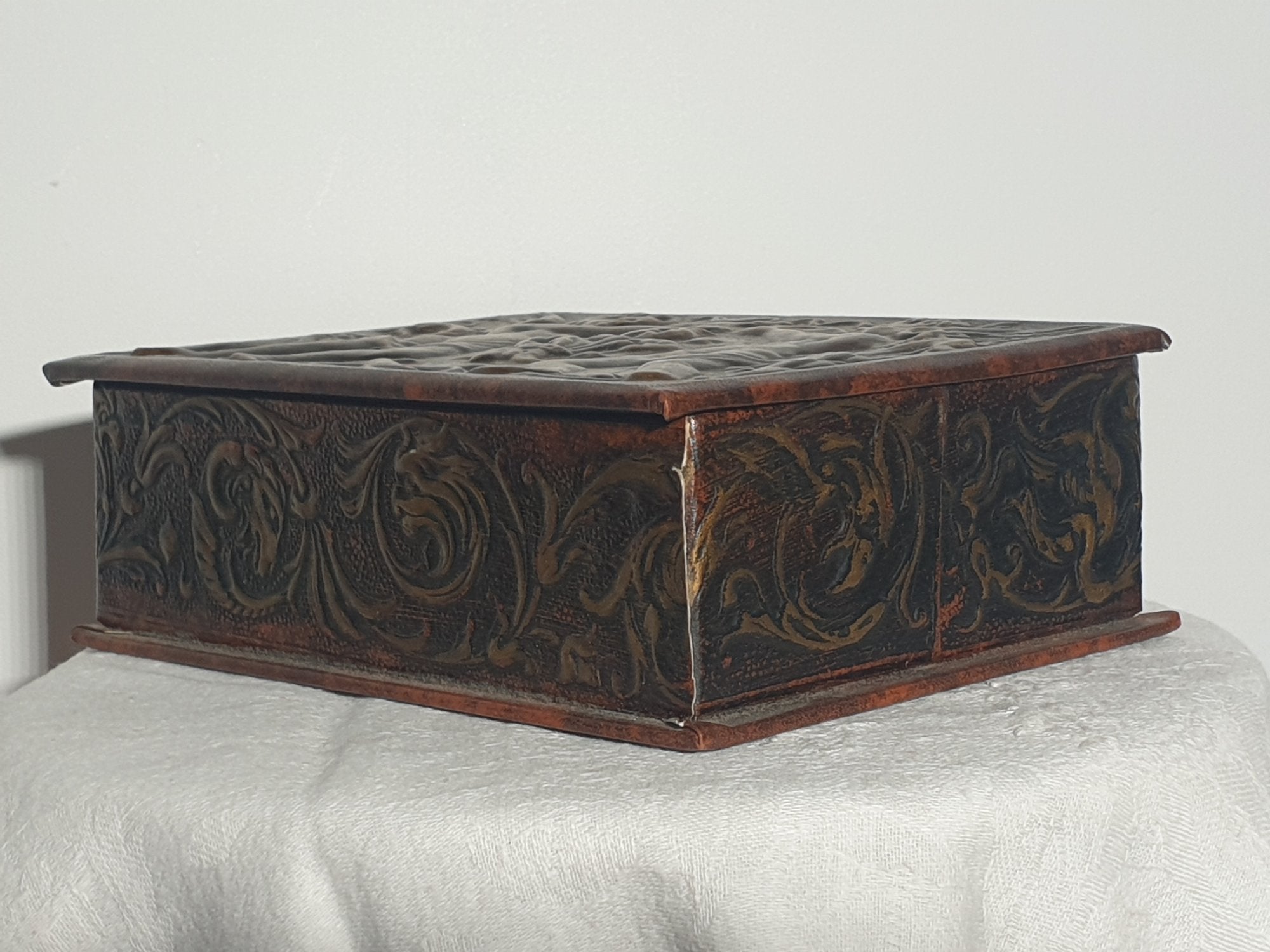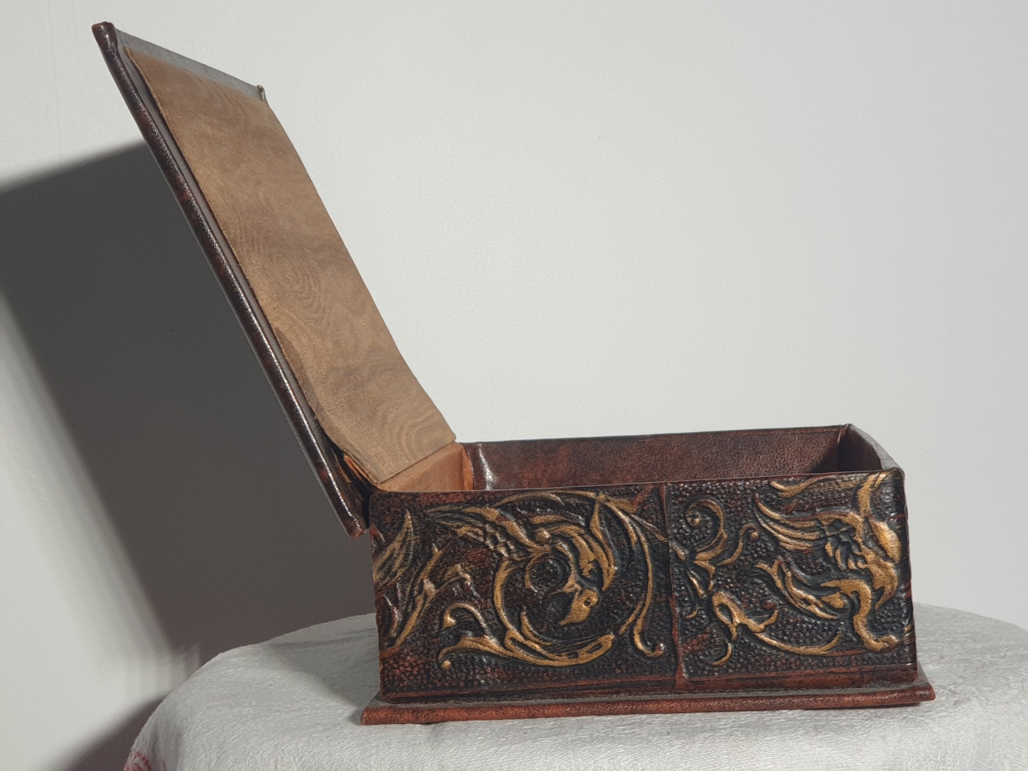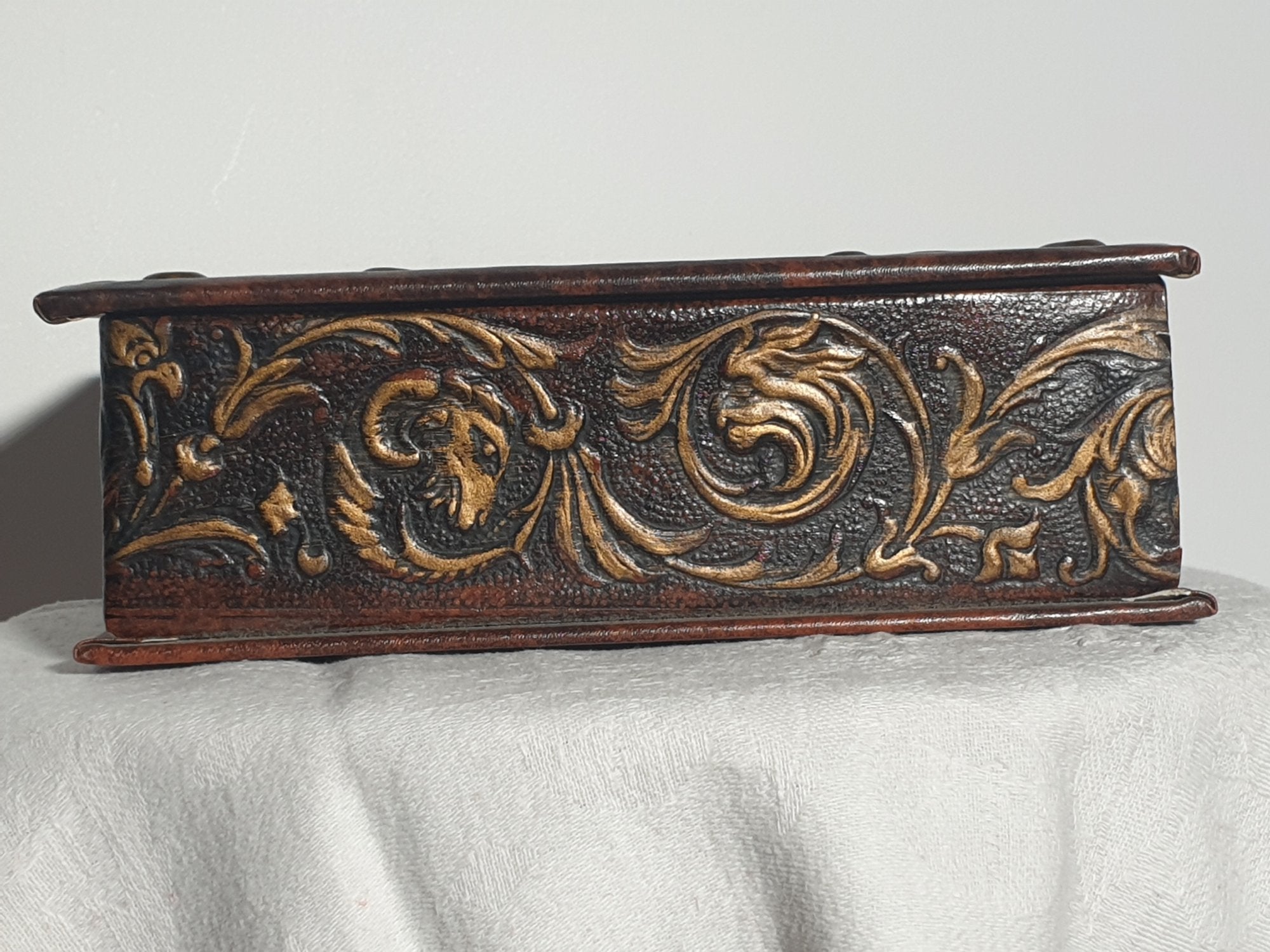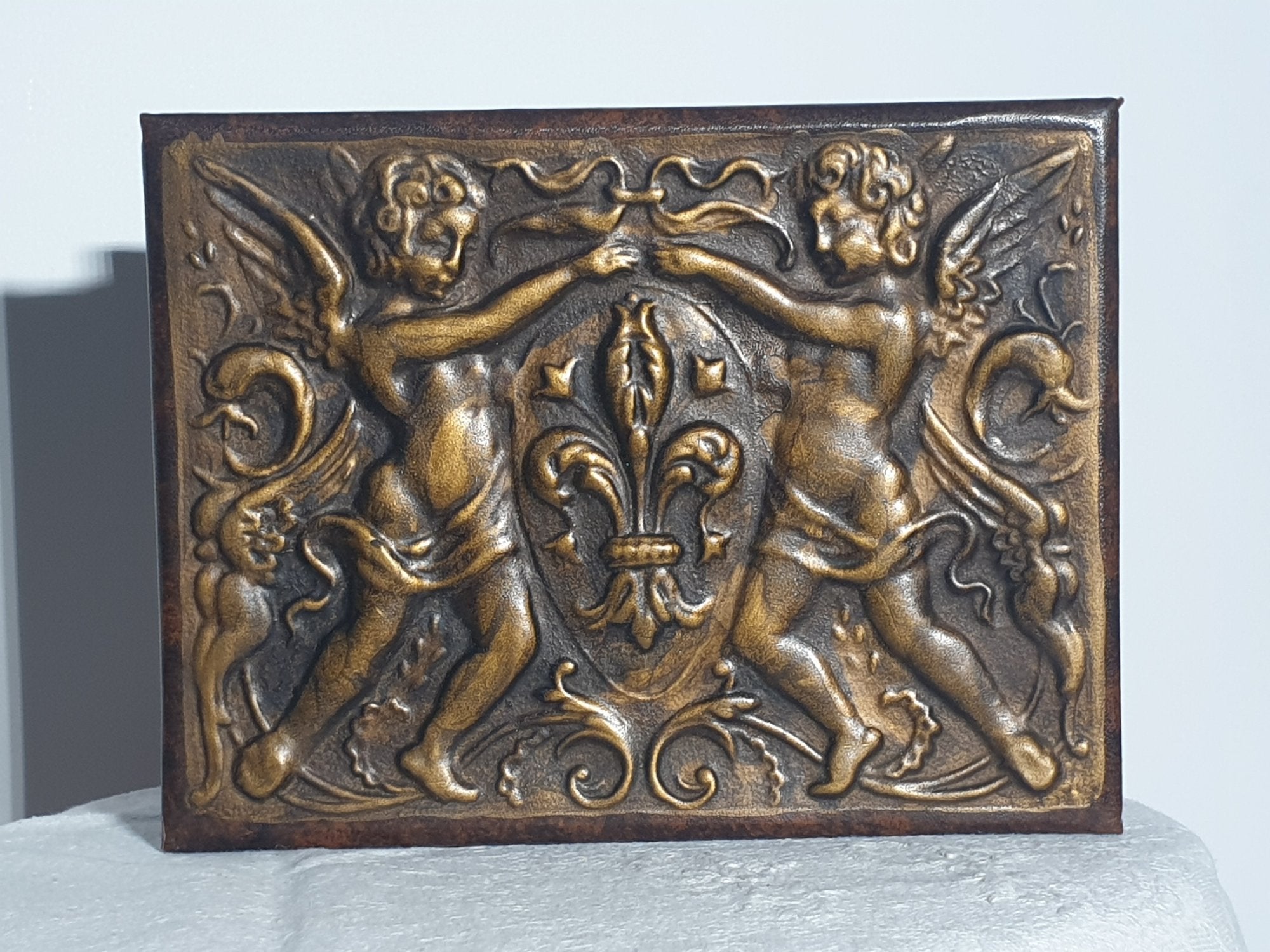 Jolie boite en carton recouvert de cuir repoussé, représentant deux anges, regardant un blason avec la fleurs de Lys, le décor du couvercle est en relief.