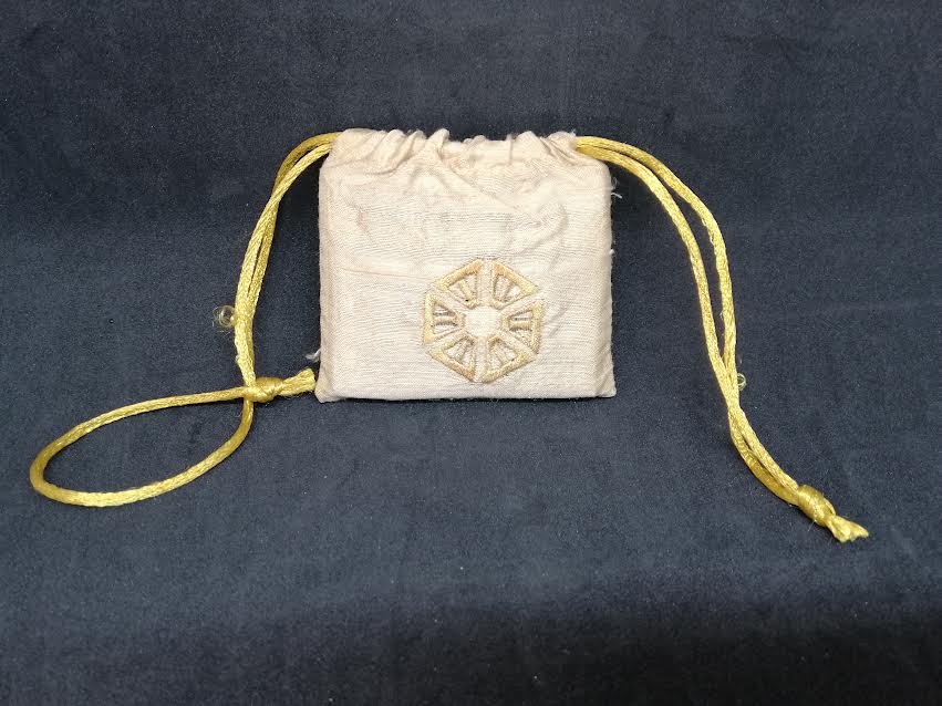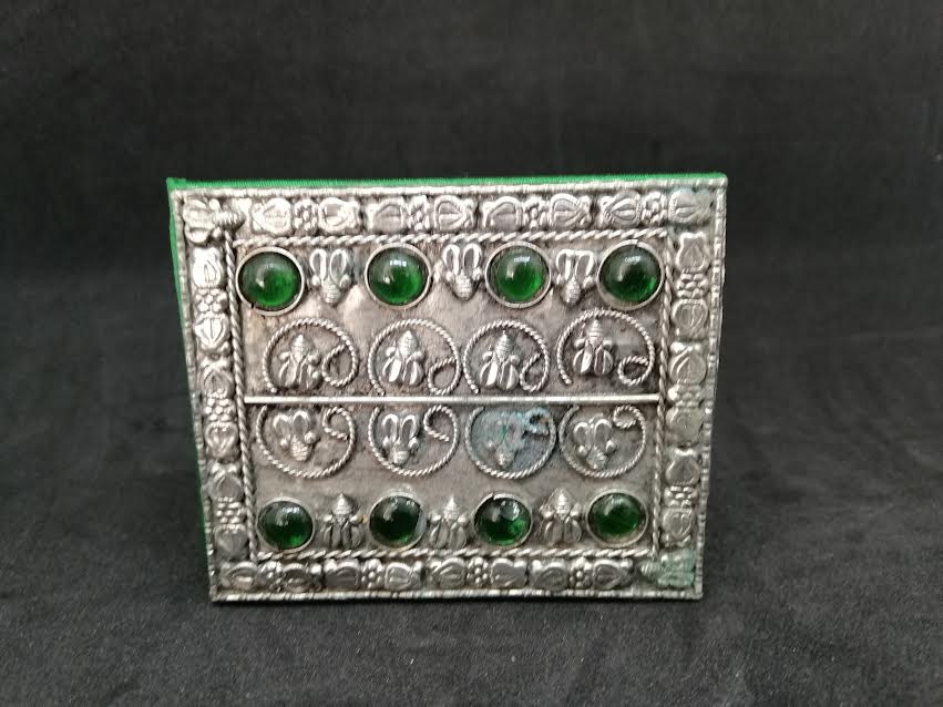 Petit cahier avec son sac, en métal argenté décoré, perles de verre vert, papier, velours vert e tissu (sac).