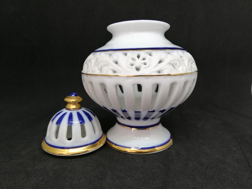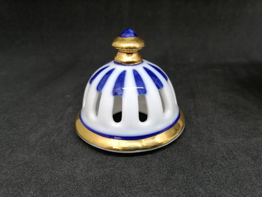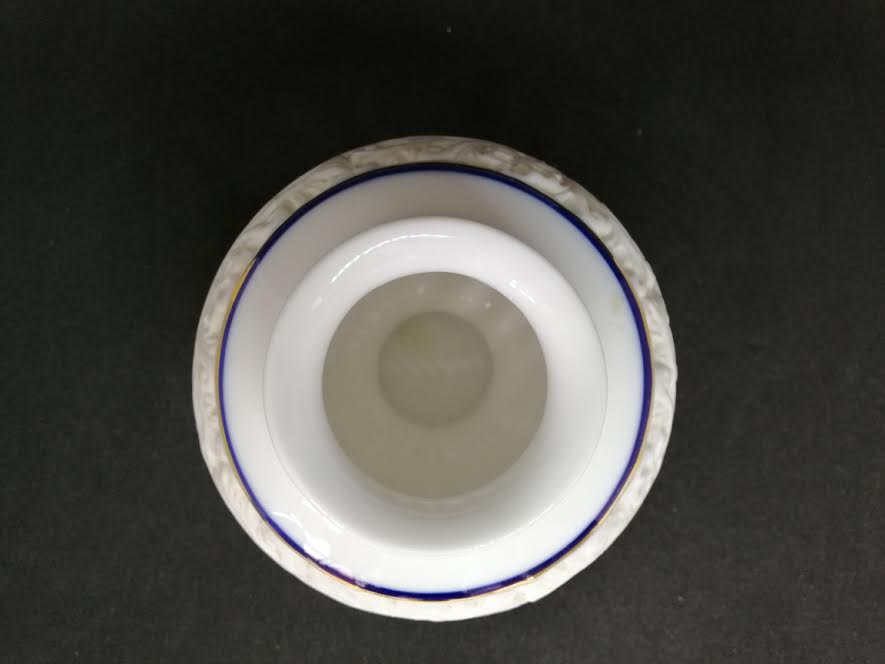 Porcelaine blanche à liserets or et bleu, décor épuré et raffiné.