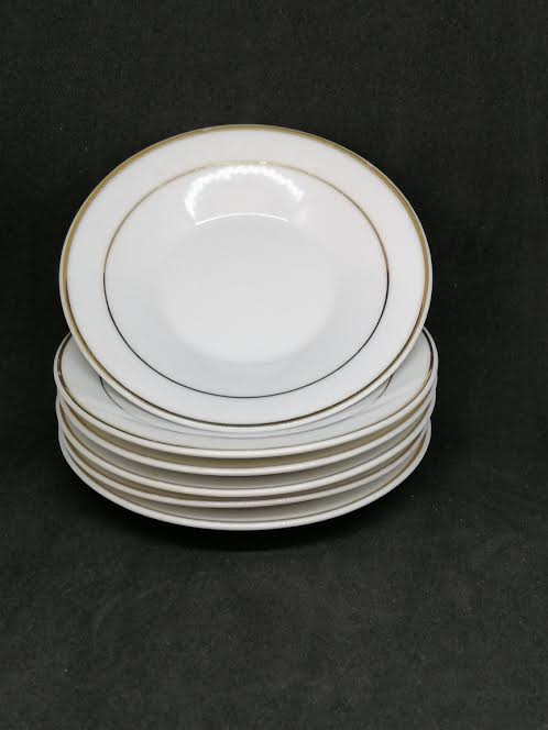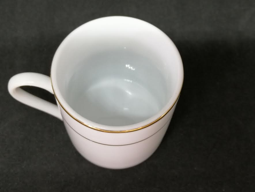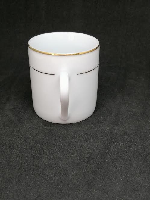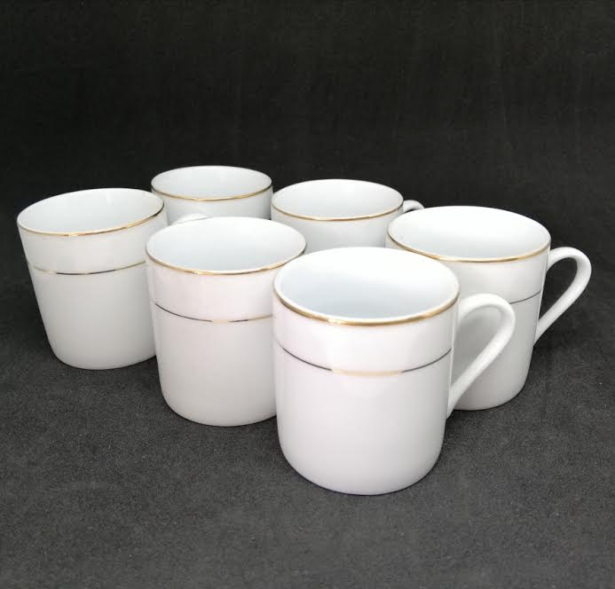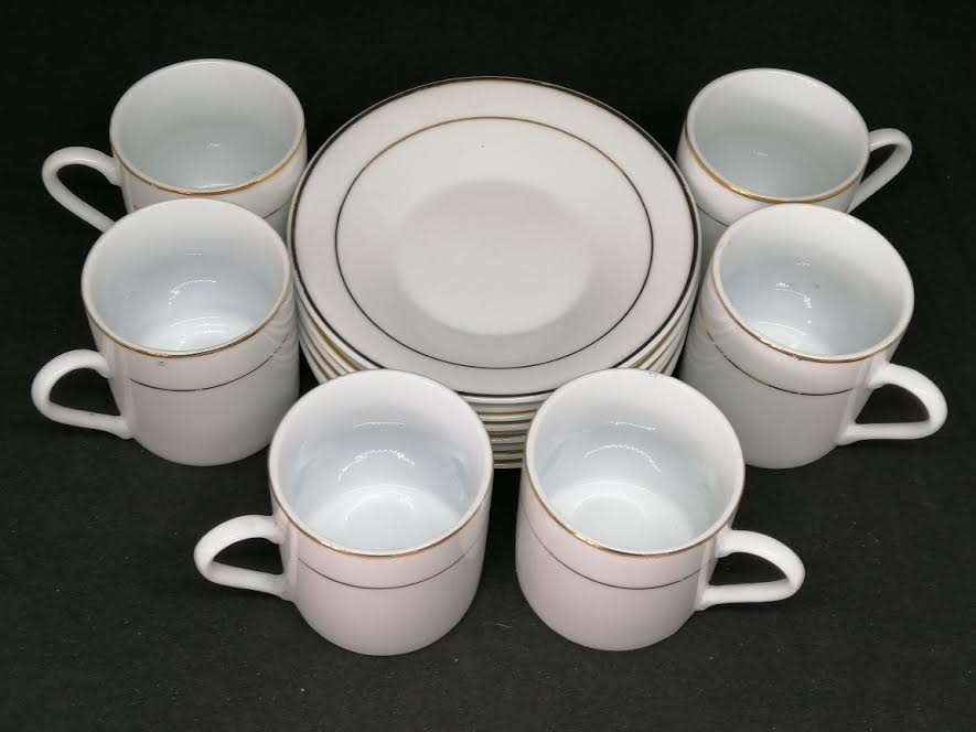 6 tasses et 6 soucoupe de couleur blanche avec frises or. Porcelaine fine.